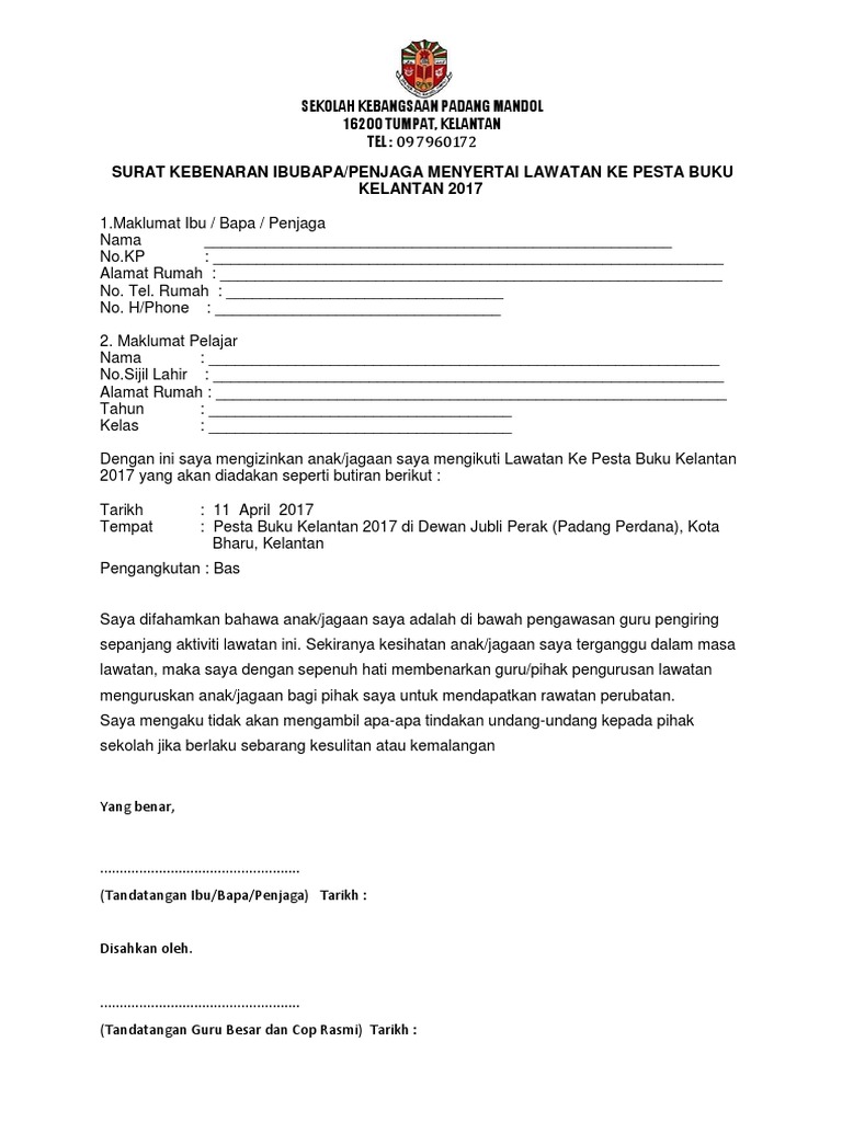 KEM PEMILIHAN BOLING PENDIDIKAN KHAS DAERAH PONTIAN Tarikh. Surat tersebut harus menerangkan secara terperinci tentang tujuan khusus surat itu dikeluarkancontohnyalawatan sambil belajar zoo negara. Surat kebenaran ibu bapa kpm.